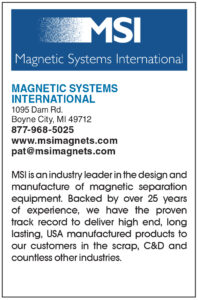 Pat Markiewicz, president of Magnetic Systems International (MSI), explained that the company specializes in problem solving. MSI offers suspended, auto-clean, permanent (SAP) magnets in a multitude of strengths and sizes for the metal recycling and other industries. “We strive to ease any pinch points that our customers might encounter and we’ve been in the business of designing and manufacturing magnetic separation equipment for over 30 years. During that time, we have seen a steady increase in demand for suspended magnets, both permanent and electromagnetic. Whether we are helping a customer that has a 12” belt with minimal burden, or a 72” belt piled with crushed C&D debris, we offer the right magnet to exceed our customer’s needs.”