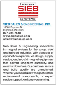Sieb Sales & Engineering, Inc. has supported magnet systems for the scrap, steel and railroad industries since 1967. The company supplies both new magnetic handling equipment and long-term support to keep operations productive and reduce downtime. “Bear in mind, there’s much more to hanging a magnet off the end of a crane than some may realize,” advised Ronald Sieb, president. “A lifting magnet is typically used in very rigorous conditions and demands steady, reliable voltage and the controls to match, depending on the application variables involved.”
