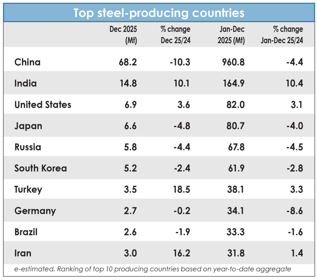 World crude steel production for the 70 countries reporting to the World Steel Association (worldsteel) was 139.6 million tonnes (Mt) in December 2025, a 3.7 percent decrease compared to December 2024.