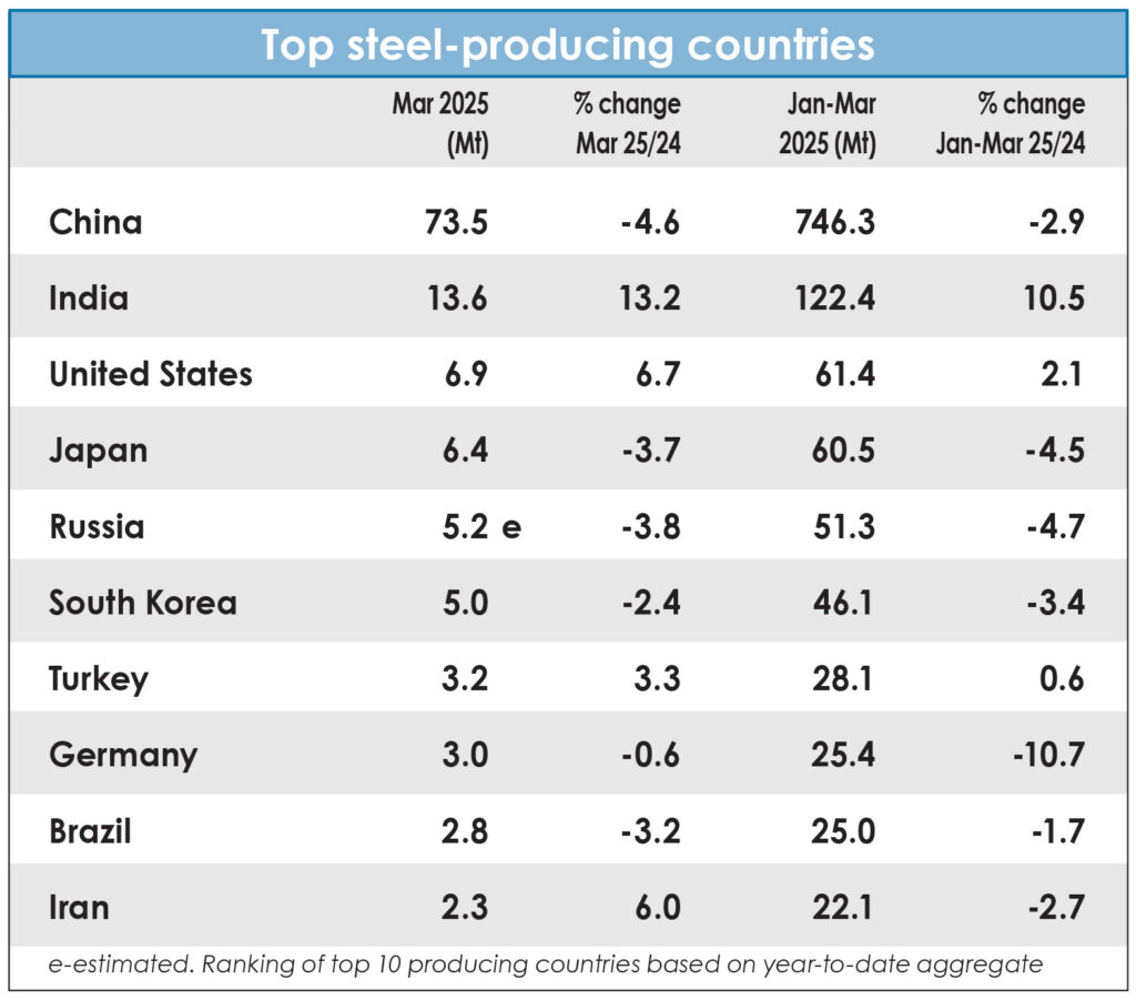 China produced 73.5 Mt in September 2025, down 4.6 percent on September 2024. India produced 13.6 Mt, up 13.2 percent. The United States produced 6.9 Mt, up 6.7 percent. Japan produced 6.4 Mt, down 3.7 percent. Russia is estimated to have produced 5.2 Mt, down 3.8 percent. South Korea produced 5.0 Mt, down 2.4 percent. Turkey produced 3.2 Mt, up 3.3 percent. Germany produced 3.0 Mt, down 0.6 percent. Brazil produced 2.8 Mt, down 3.2 percent. Iran produced 2.3 Mt, up 6.0 percent.