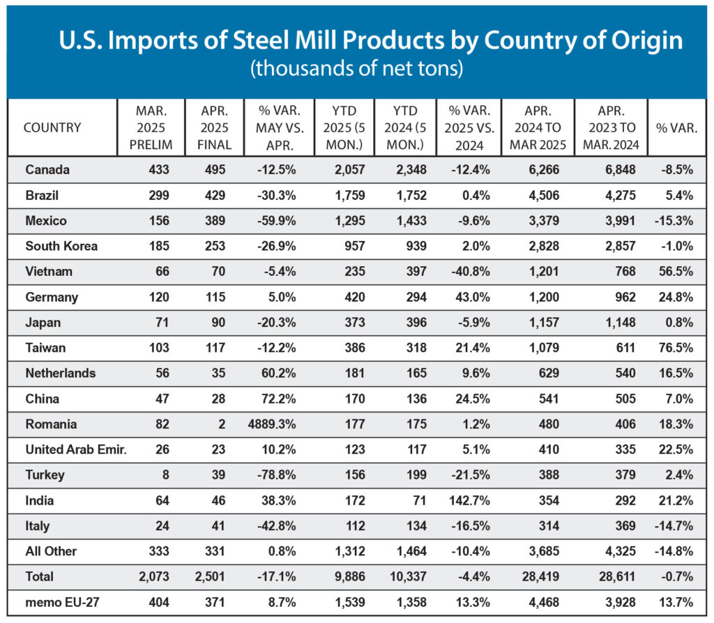 Key steel products with a significant import increase in April compared to March are tin plate (up 43 percent), oil country goods (up 26 percent) and wire rods (up 14 percent). Products with a significant increase in imports over the 12 month period May 2024 to April 2025 compared to the previous 12-month period include tin plate (up 73 percent), wire rods (up 14 percent), sheets and strip all other metallic coated (up 14 percent), line pipe (up 14 percent) and heavy structural shapes (up 11 percent).