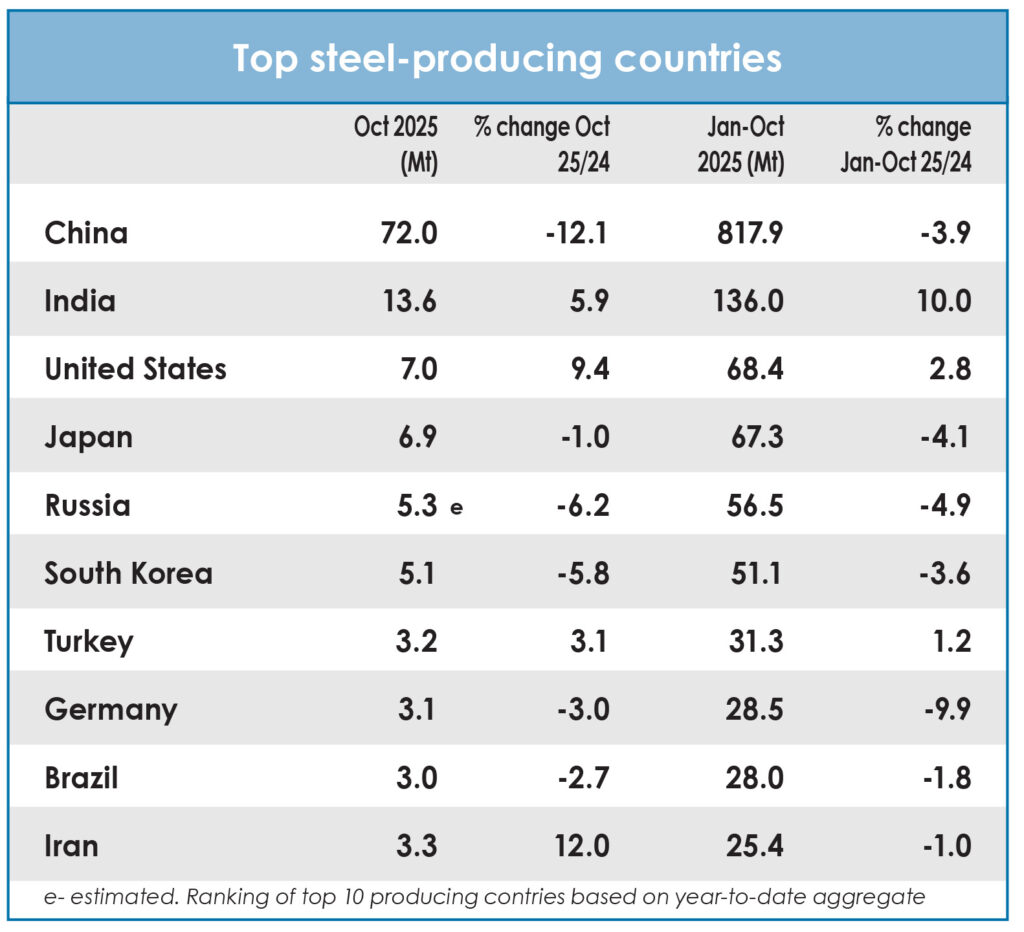 World crude steel production for the 70 countries reporting to the World Steel Association (worldsteel) was 143.3 million tonnes (Mt) in October 2025, a 5.9 percent decrease compared to October 2024.